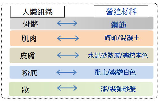 如果以仿生概念來比喻,人體組織來對比牆壁結構材料,如圖所示