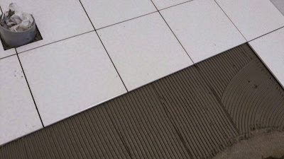貼磚前將水泥粉灑於濕水泥砂上,再貼磚。