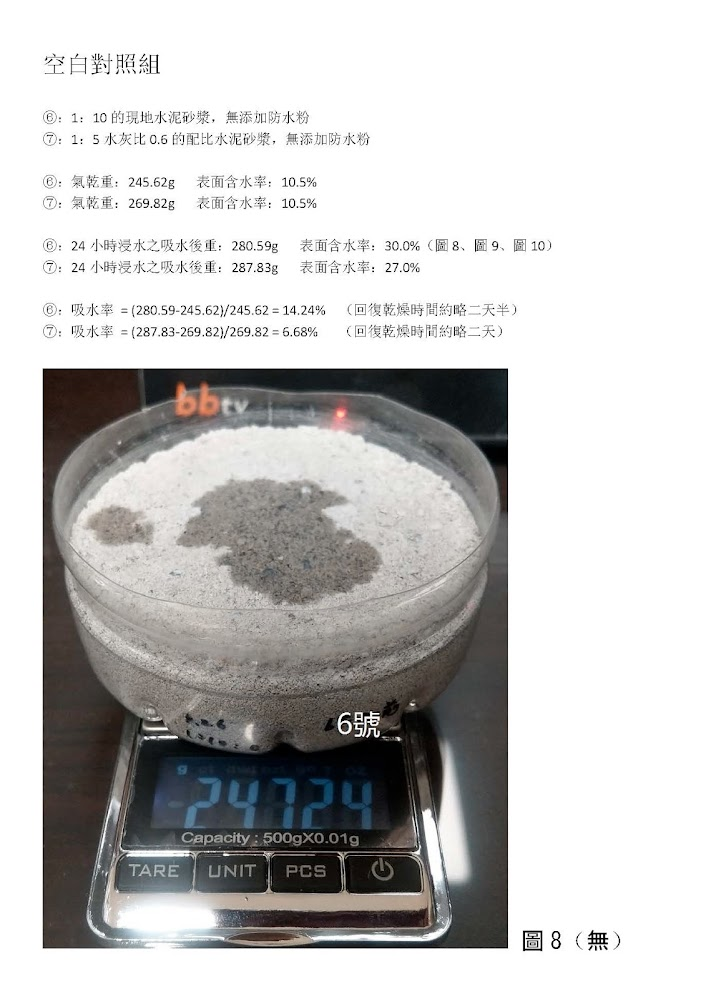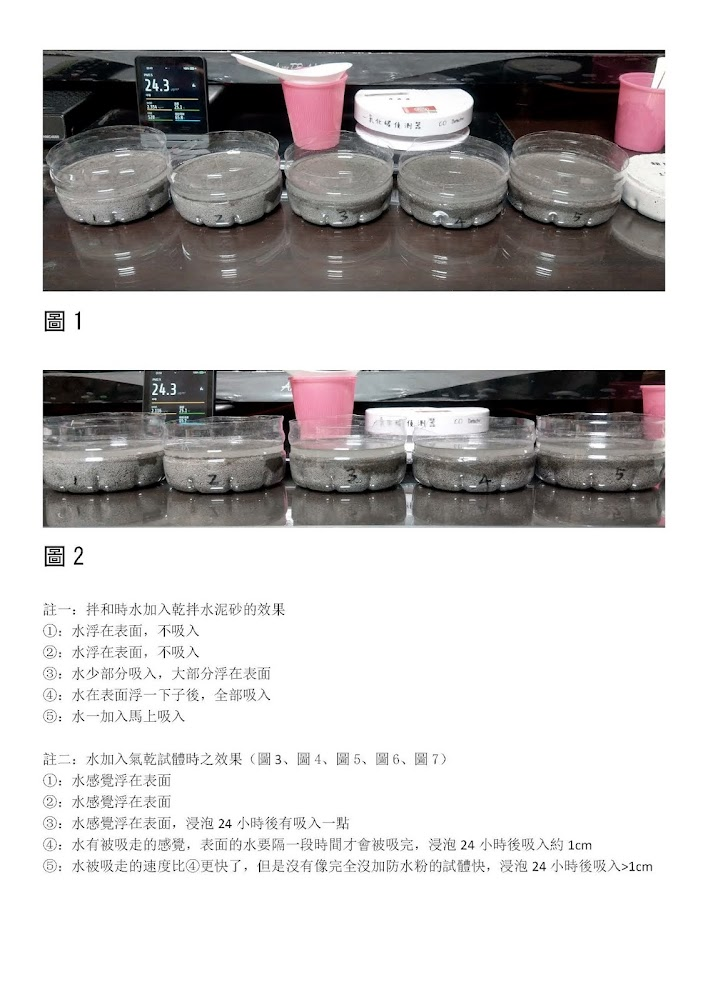2. 砂漿氣乾後, 水浮在表面,24小時後有吸入一些。